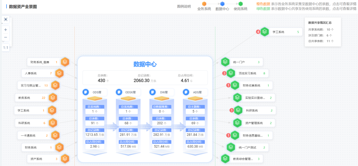 数据生态平台现已规范学校现有数据字典10份,发布了7大类387个数据标准,制定数据治理制度规范文件6份,完成了11个业务系统数据采集、清洗、汇聚,并形成学校、教师、学生、财务、科研、资产6大主题数据。构建数据质量规则库规则43条,质检方案7份,生成质量检查报告17份,规范共享数据接口59个,为教务、学工、财务、资产、科研、门户、顶岗实习、实训等12个系统提供数据共享服务,有力促进了学校各部门、各系统之间的数据共享,打通各业务系统内基础数据应用孤岛。