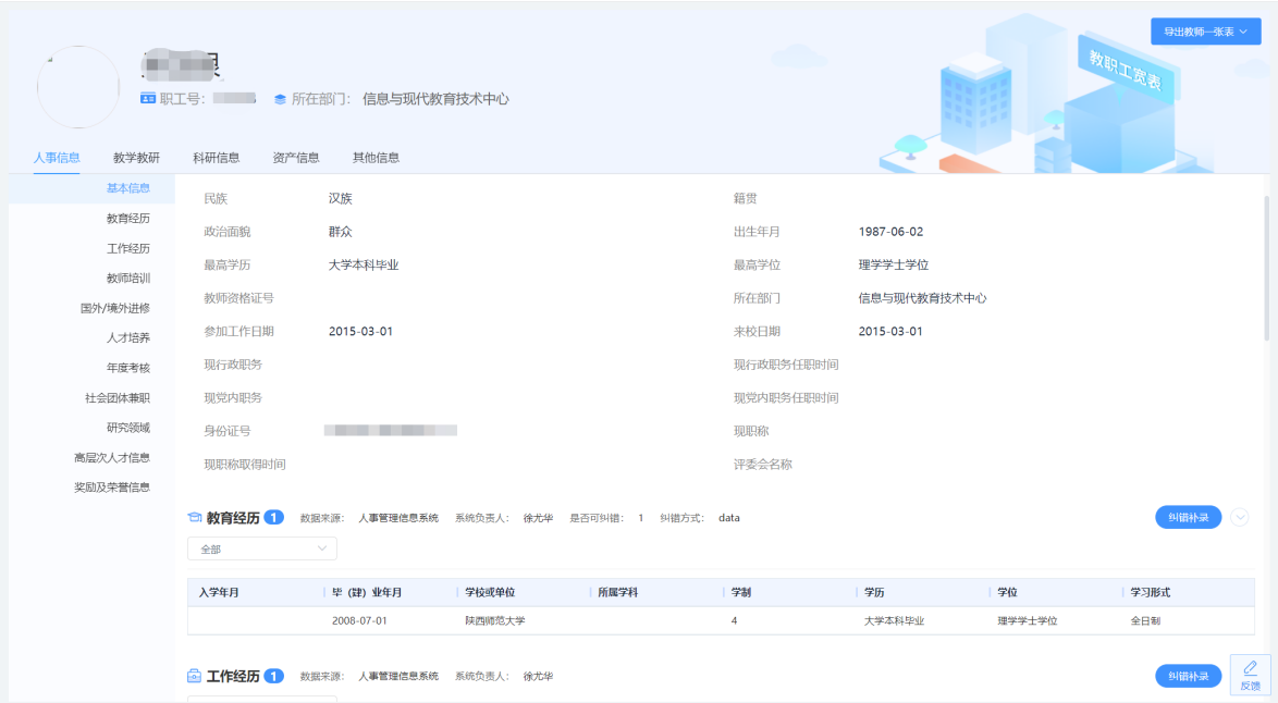 近年来学校不断强化数据资产在学校的基础性战略资源地位,着力打造全量全域全链路数据资产,持续开展数据治理、推动“一数一源”,不断提升数据质量,提高数据服务能力。因此,项目团队多次召开学校数据治理相关会议,深入职能部门,持续开展人事、教务、科研等业务系统的数据治理,数据质量稳步提升。目前我校取得了“1+2”的阶段性成果:1个数据生态平台,2个数据服务应用场景,即:教师一体化查询应用、智能表格填报。