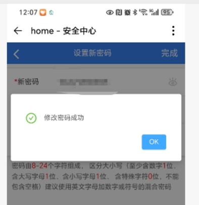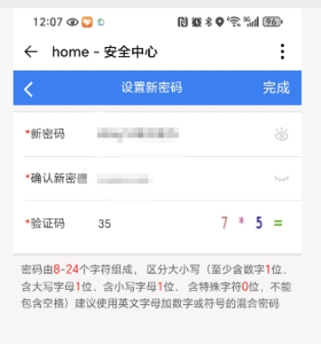 7、输入两遍新密码及验证码后点“完成”弹出修改成功即可。