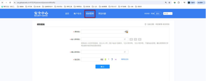 5、修改密码:点击密码管理,在页面输入框输入原密码、新密码、验证码即可修改密码。