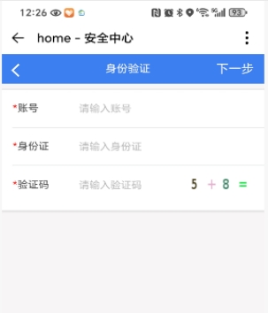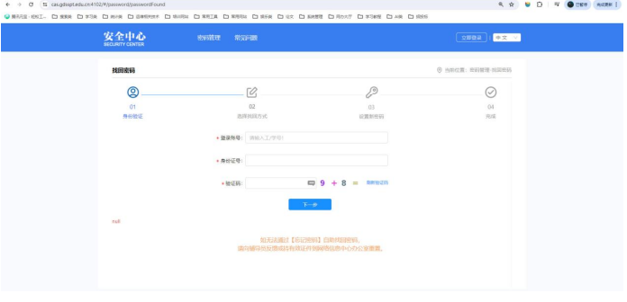 4、找回密码:在页面输入框输入登录账号、身份证、验证码点击下一步。