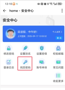 4、返回“统一认证安全中心”界面,并点击“找回密码”