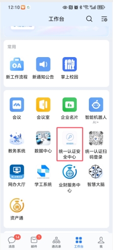 1、加入学校企业微信后,在“工作台”中找到“统一认证安全中心”并点击进入。